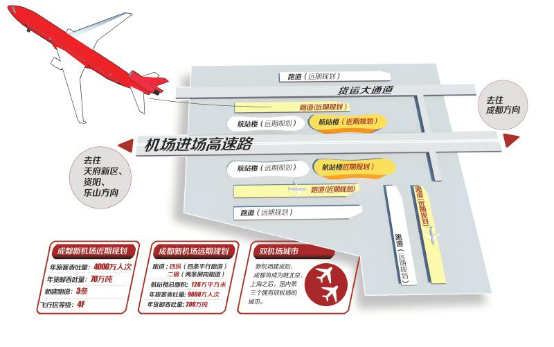 成都新机场近期按照年旅客吞吐量4000万人次、年货邮吞吐量70万吨的规模设计建设,新建三条跑道,飞行区等级为4F;远期将规划建设四纵(四条平行跑道)二横(两条侧向跑道)共6条跑道,航站楼总面积约126万平方米,能够满足年旅客吞吐量9000万人次和年货邮吞吐量200万吨的需求。新机场建成后,成都将成为继北京、上海之后,国内第三个拥有双机场的城市。