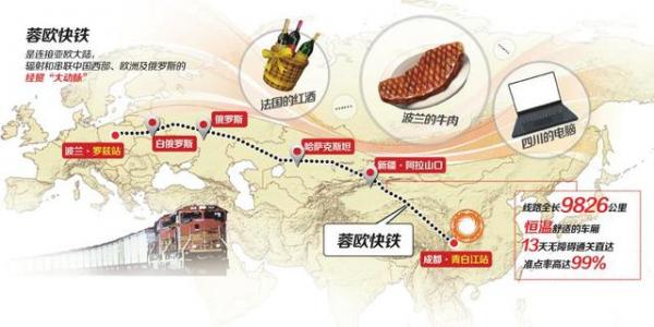 2013年4月26日“蓉欧快铁”开行,该趟列车从成都青白江集装箱中心站出发,经宝鸡、兰州到新疆阿拉山口出境,途经哈萨克斯坦、俄罗斯、白俄罗斯等国直达波兰罗兹站,线路全长9826公里,其中成都至阿拉山口3511公里,阿拉山口至罗兹6315公里。运输时间是传统铁海联运时间的三分之一,运价是空运费用的四分之一。