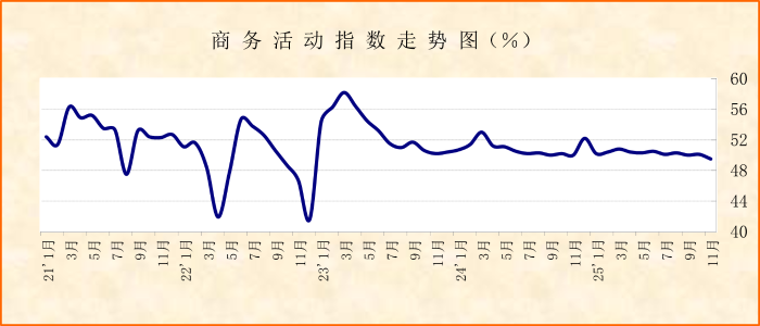 国家统计局服务业调查中心、中国物流与采购联合会发布的2025年11月份中国非制造业商务活动指数为49.5%,较上月下降0.6个百分点,显示非制造业经营活动有所放缓。受上月黄金假期高基数影响,消费相关服务业活动呈现淡季回落特征,导致非制造业整体经营活动有所放缓。细分指数变化显示,金融活动持续发力,新动能行业运行稳健,建筑业活动有所恢复,企业乐观预期保持稳定。