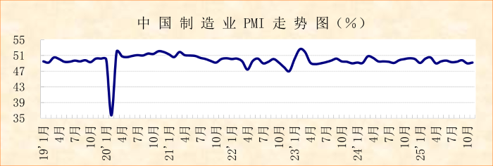 国家统计局服务业调查中心、中国物流与采购联合会发布的2025年11月份中国制造业采购经理指数(PMI)为49.2%,较上月上升0.2个百分点,且大部分分项指数较上月有所上升,显示11月制造业出口趋稳运行,需求整体有所恢复,生产活动持稳运行,产成品去库有所加快,原材料价格加快上升,产成品价格降势收窄。综合来看,11月指数总体向好,制造业稳中有升。预计12月制造业将继续趋稳恢复。
