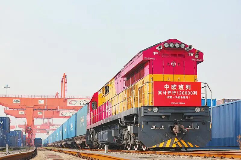 11月28日,一列满载55个集装箱的中欧班列从成都国际铁路港驶出。该趟班列是中欧班列累计开行的第12万列。至此,中欧班列累计发送货值超4900亿美元。