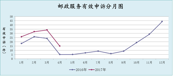 4月,四川省邮政管理局共办理涉及邮政服务问题的有效申诉15件,环比下降55.9%;同比增长200%。