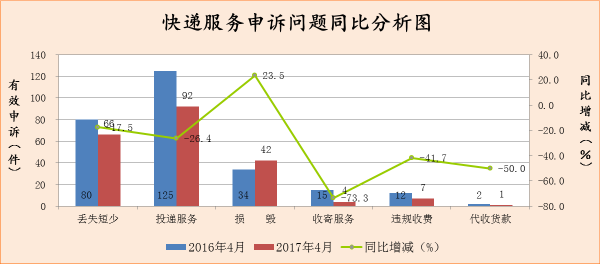 申诉的邮政服务问题是丢失短少(7件,占邮政服务问题有效申诉的46.7%)、延误(4件,占邮政服务问题有效申诉的26.7%)、投递服务(3件,占邮政服务问题有效申诉的20.0%)、违规收费(1件,占邮政服务问题有效申诉的6.7%)。