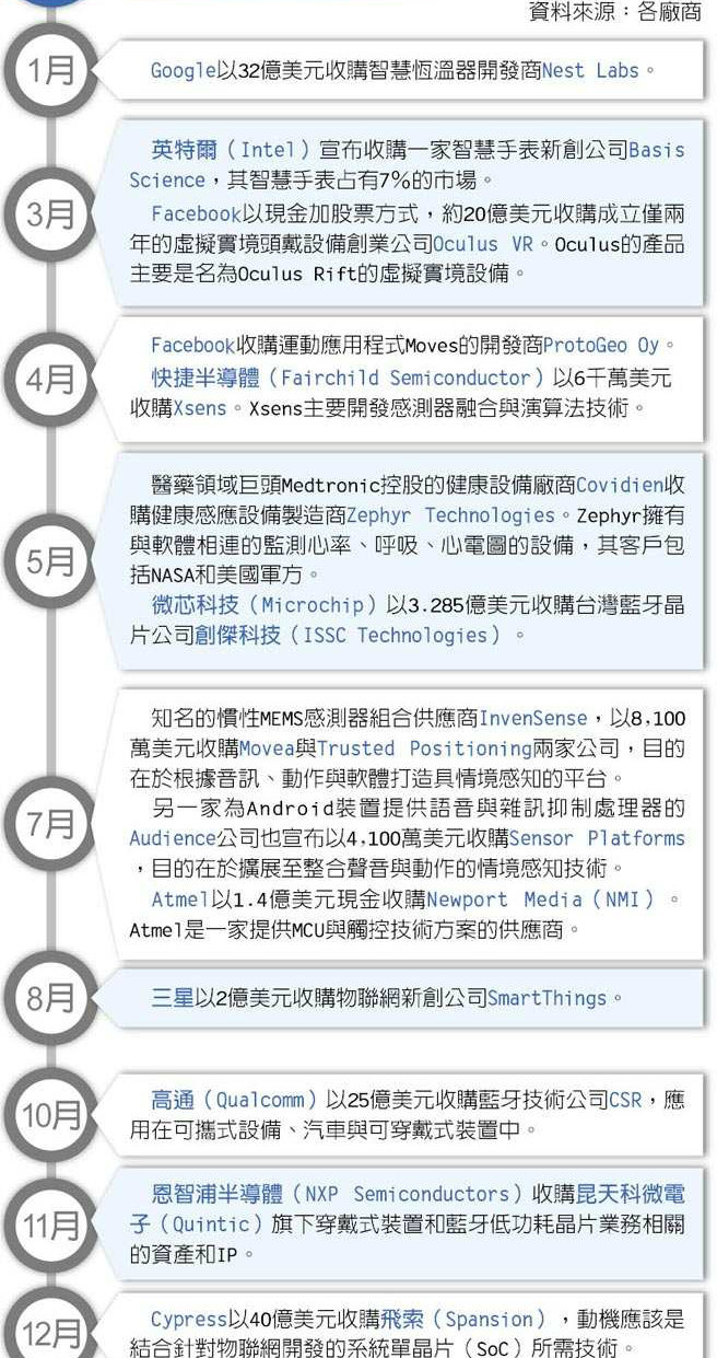 在2014年完成的并购案还包括叁星于2014年8月以2亿美元收购从Kickstarter集资网站起家的物联网新创公司 SmartThings。SmartThings的产品包括照明开关、水质感测器以及门锁。这些产品都可连接至iOS/Android app,让消费者能够在远端进行控制与监测。而Facebook收购虚拟实境技术供应商Oculus,以及英特尔(Intel)收购智慧手表新创公司 Basis Science,医材大厂 Medtronic并购Covidien等等。