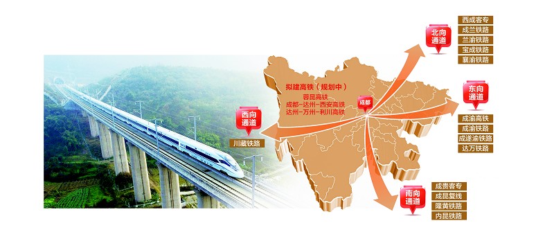 视野放得更宽些。以成都为出发点,成渝高铁东端与渝万、渝黔普速铁路贯通,今后还将连接拟建的渝湘高铁、渝黔高铁、郑万高铁以及沿江高铁,将使四川能够实现与中东部省区更加方便、快捷地连接,极大地提升四川西部综合交通枢纽的地位。