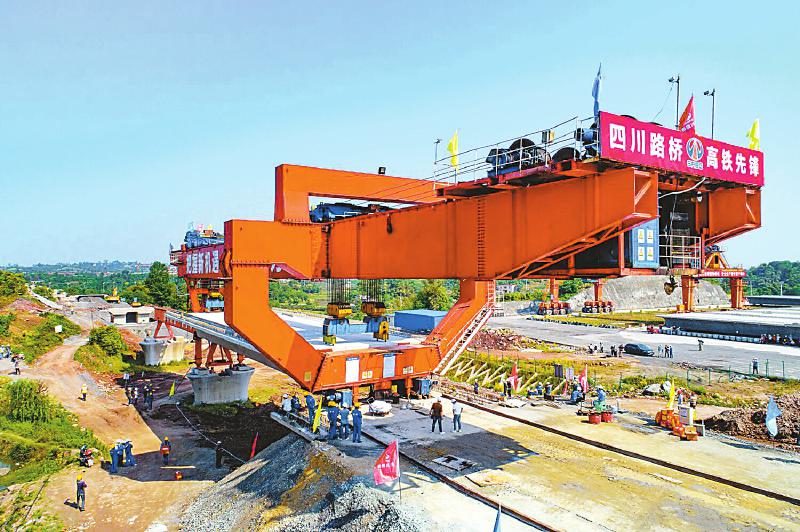 4月22日10时30分,泸州市泸县福集镇民兴村,一台900吨重的巨型提梁机将重达720吨的一榀箱梁,准确安放在川南城际铁路CN-4标段铁路桥墩柱上。这标志着川南城际铁路泸州段首榀箱梁架设成功,该段项目施工进入桥梁架设阶段。