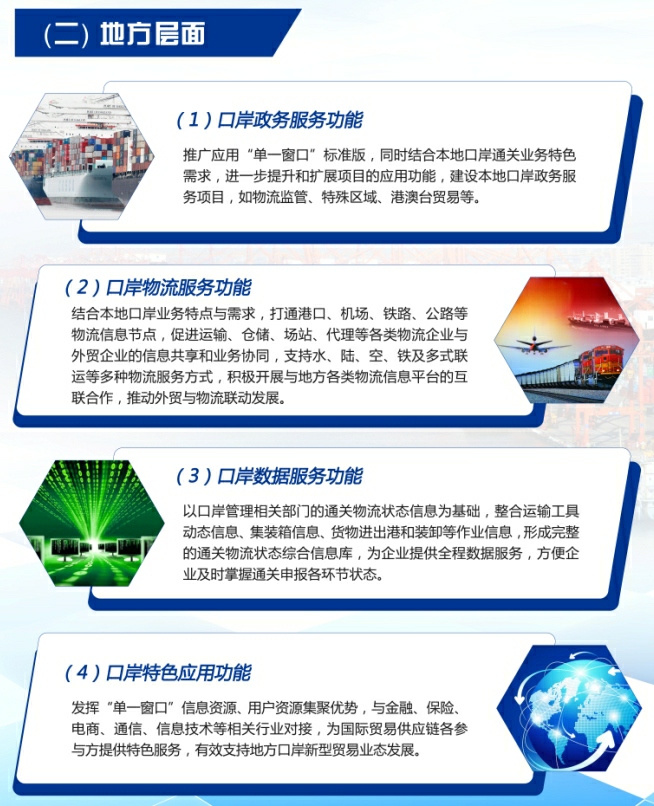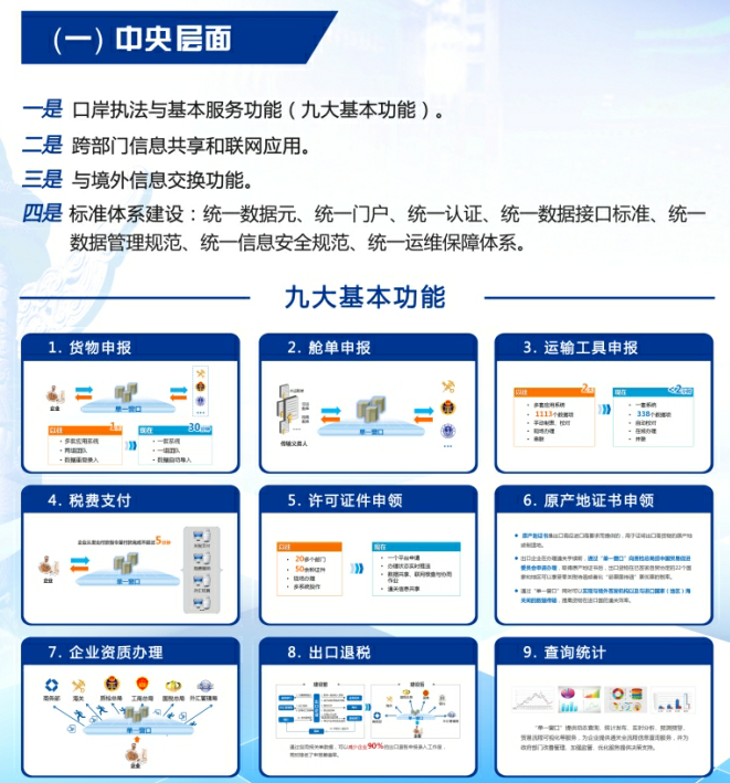 我国“单一窗口”建设按照中央和地方两级分工分贝开展,共同推进,相互促进。中央层面统筹推进“单一窗口”基本功能建设,统一有关标准规范;地方层面拓展实施“单一窗口”特色服务功能。