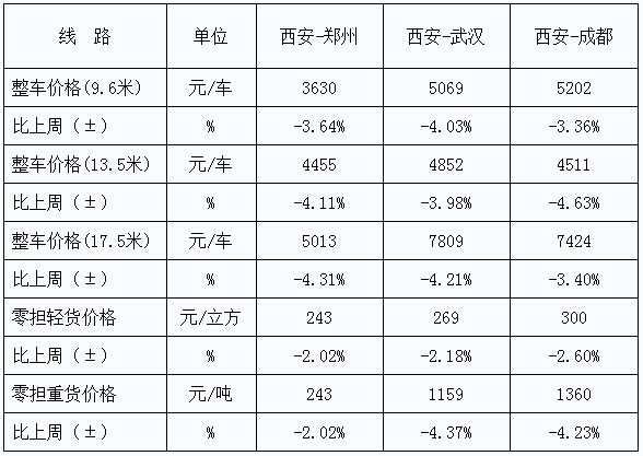 从分地区指数来看,西北、华中地区运价指数较上周回落幅度相对较高,降幅超过3.7%;东北、长三角地区运价指数回落幅度则相对较低,降幅不到3.2%。