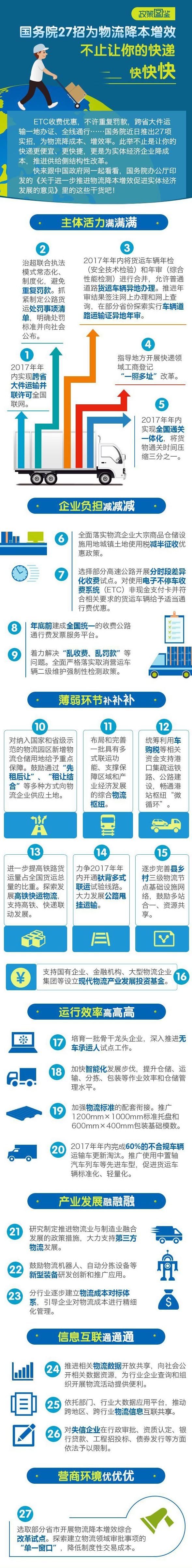 ETC收费优惠,不许重复罚款,跨省大件运输一地办证、全线通行……国务院近日推出27项实招,为物流降成本、增效率。此举不止是让你的快递更便宜、更快捷,更是为实体经济企业降成本,推进供给侧结构性改革。