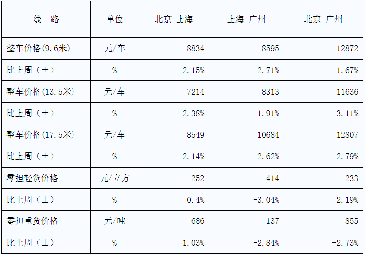 各车型指数均有不同程度回升,整车指数回升幅度略高于零担指数。在零担指数中,零担重货指数回升幅度高于零担轻货指数。其中,整车指数为1023.47点,比上周回升0.23%;零担轻货指数为1110.98点,环比回升0.01%;零担重货指数为1041.87点,环比回升0.21%。