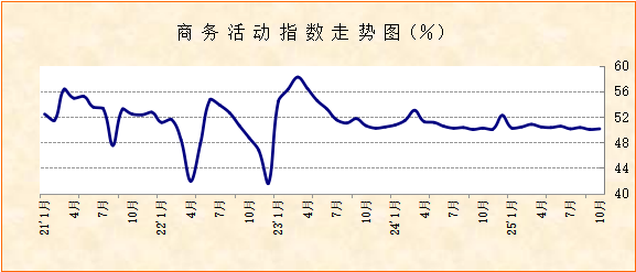 国家统计局服务业调查中心、中国物流与采购联合会发布的2025年10月份中国非制造业商务活动指数为50.1%,较上月微幅上升0.1个百分点,今年以来持续保持在50%及以上的水平,新订单指数虽仍在50%以下,但与上月持平,显示非制造业经营活动继续趋稳运行,需求侧相对稳定。在供需相对稳定的带动下,上下游价格有积极变化,投入品价格指数和销售价格指数较上月均有小幅上升,分别升至49.4%和47.8%。细分指数变化显示,节日消费带动作用明显,基础建设投资相关活动有加速启动迹象,企业乐观预期有所升温。