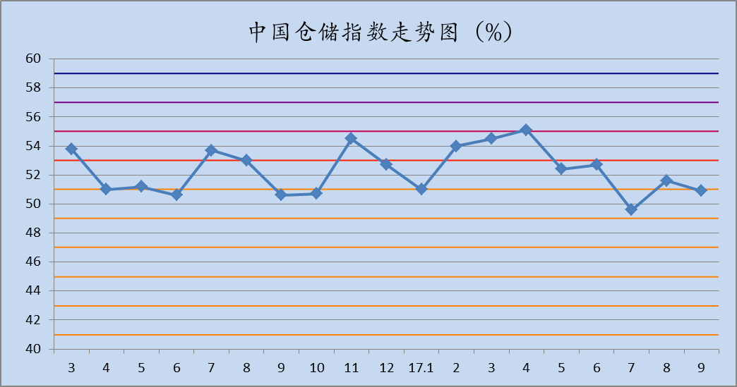 中国物流与采购联合会与中储发展股份有限公司联合调查的中国仓储指数2017年9月为50.9%,较上月回落0.7个百分点。各分项指数中,主营业务成本指数、平均库存周转次数指数、企业员工指数较上月有所回升,其余指数均有不同程度的回落。