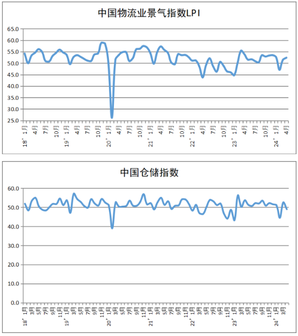 中国物流与采购联合会发布的2024年4月份中国物流业景气指数为52.4%,较上月回升0.9个百分点;中国仓储指数为49%,较上月回落3.6个百分点。