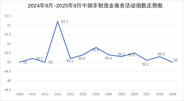 国家统计局服务业调查中心、中国物流与采购联合会发布的2025年9月份中国非制造业商务活动指数为50%,环比下降0.3个百分点。由于非制造业没有综合指数,通常以商务活动指数来反映非制造业经济的总体变化。