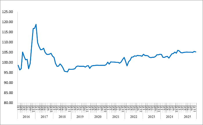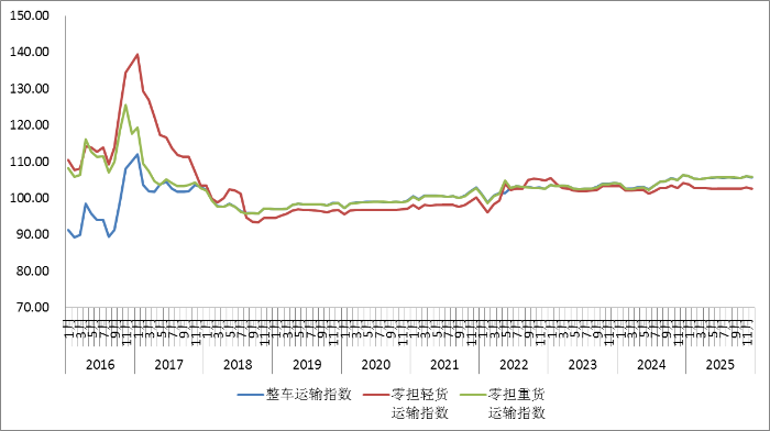 2025年12月份,由中国物流与采购联合会和林安物流集团联合调查的中国公路物流运价指数为105.2点,环比回落0.22%,同比去年回落0.70%。从月内看,第一、二、三周运价指数环比回落。第四周运价指数环比回升。