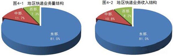 1-7月,东、中、西部地区快递业务量比重分别为81%、11.7%和7.3%,业务收入比重分别为81%、10.8%和8.2%。与去年同期相比,东部地区快递业务量比重下降了0.2个百分点,快递业务收入比重下降了0.2个百分点;中部地区快递业务量比重下降了0.1个百分点,快递业务收入比重上升了0.1个百分点;西部地区快递业务量比重上升了0.3个百分点,快递业务收入比重上升了0.1个百分点。