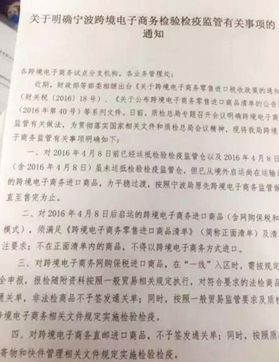 网络上流传的《关于明确宁波跨境电子商务检验检疫监管有关事项的通知》