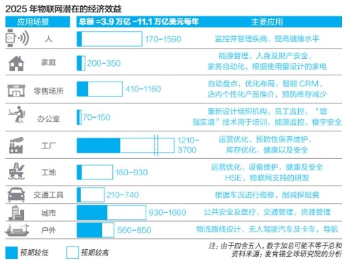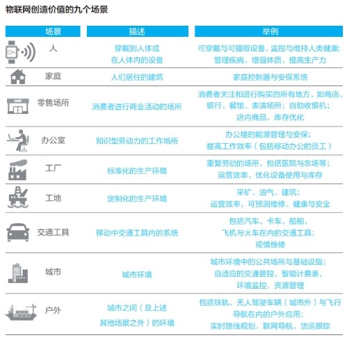 麦肯锡公司确定了八个场景,包括家庭、办公室、工厂、工地(采矿、油气、建筑)、零售场所、城市、车辆与户外。此外,还关注了“人”的场景,包括穿戴到人体、可以监控慢性病与运动量的系统,以及提高生产力的应用。