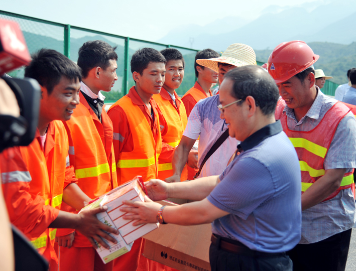 在昌九高速公路改扩建工程通远试验段、九江绕城高速公路施工工地,鹿心社与施工人员亲切握手交谈,代表省委、省政府向奋战一线的建设者表示亲切慰问,并给他们送上防暑降温用品,叮嘱项目负责人要合理安排作业时间,做好高温天气的防暑降温工作。