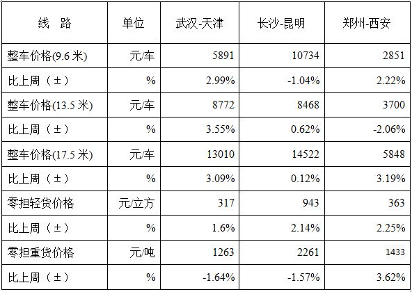各车型指数环比均有不同程度回升,整车指数回升幅度高于零担指数,在零担指数中零担重货指数回升幅度高于零担轻货指数。其中,整车指数为1048.1点,环比回升0.72%,比上年同期增长10.2%;零担轻货指数为1188.1点,环比回升0.59%;零担重货指数为1047.8点,环比回升0.62%。