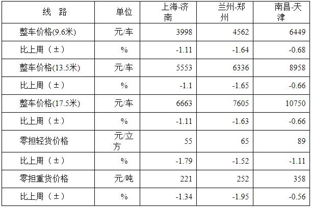 表1 本周部分线路平均价格及环比情况对比