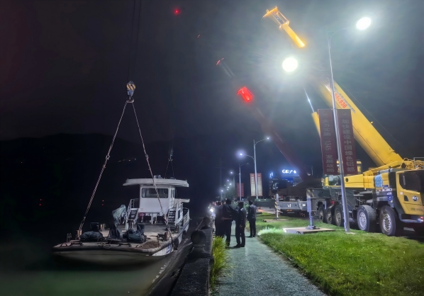 作为守护航道安全的“硬核装备”,川广航政 0010号船长26米、宽6.2米,自重接近100吨。如何安全高效地将这一“巨无霸”从亭子湖库区转运至栖凤湖库区,成为对广元航道段组织协调能力的重大考验。为此,广元航道段成立专项工作组,历经多轮实地勘察与精密测算,最终敲定“水运 + 汽运吊装 + 陆运”的翻坝运输方案——船舶先经水路航行至指定接驳点,通过专业气囊转运至陆域场地,再由重型吊车吊装至运输车辆,陆运穿越坝区后,再次吊运入水,精准抵达栖凤湖停靠码头。