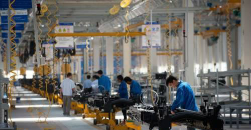 陕汽榆林东方新能源专用汽车有限公司总装车间 工人正在组装新能源重卡汽车