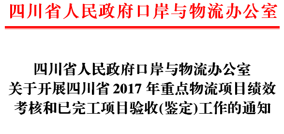 为规范项目管理,确保省重点物流项目建设质量,评价项目绩效,根据《四川省人民政府口岸与物流办公室关于印发<四川省2017年重点物流项目推进方案>的通知》(川口物办发〔2016〕1号)(以下简称《推进方案》)《四川省财政厅 四川省人民政府口岸与物流办公室关于印发<四川省促进现代物流业发展专项资金管理办法>的通知》(川财建〔2015〕13号)(以下简称《管理办法》)有关规定,现就开展2017年重点物流项目绩效考核和已完工项目验收(鉴定)工作有关事项通知如下。